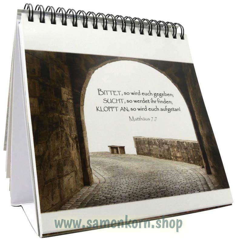 Aufstellbuch mit 52 ermutigenden Bibelversen und verschiedenen Fotos und Illustrationen.