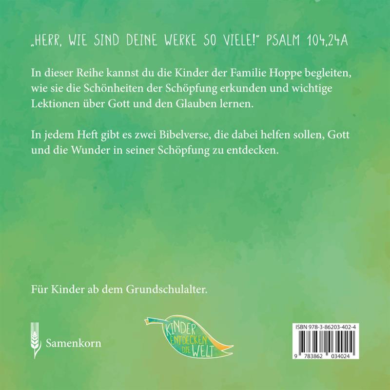 In dieser Reihe kannst du die Kinder der Familie Hoppe begleiten, wie sie die Schönheiten der Schöpfung erkunden und wichtige Lektionen über Gott und den Glauben lernen. In jedem Heft gibt es zwei Bibelverse, die dabei helfen sollen, Gott und die Wunder in seiner Schöpfung zu entdecken.