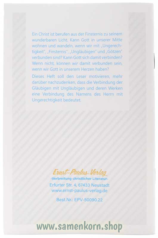 Dieses Heft soll den Leser motivieren, mehr darüber nachzudenken, dass die Verbindung der Gläubigen mit Ungläubigen und deren Werken eine Verbindung des Namens des Herrn mit Ungerechtigkeit bedeutet.