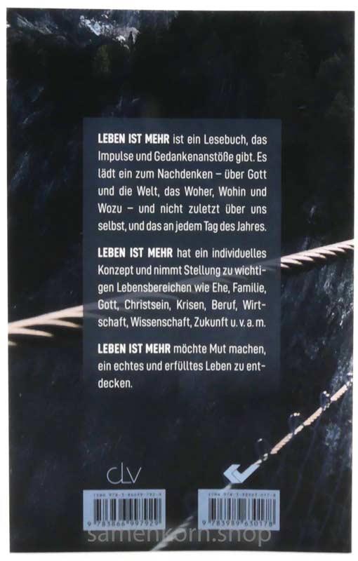 »Leben ist mehr« ist ein evangelistisches Lesebuch für Leute von heute, das in zeitgemäßer Sprache und Aufmachung mehr als nur Impulse gibt. Es bietet konkrete Antworten auf unser Woher, Wohin und Wozu und bringt portionsweise das Evangelium nahe, ohne aufdringlich zu wirken. Dieses Lesebuch nimmt zu vielen wichtigen Lebensbereichen Stellung und macht Mut, ein echtes und erfülltes Leben in Christus zu entdecken. Es eignet sich besonders gut zur Weitergabe (z.B. als Weihnachtspräsent) an Freunde, Nachbarn, Kollegen usw.