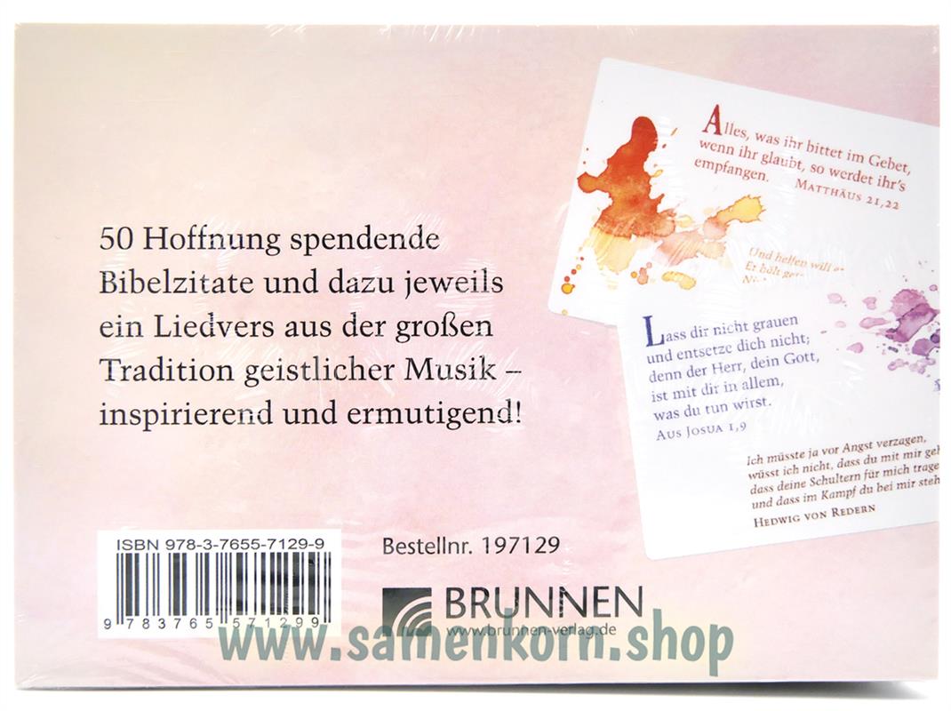Für die netten Gäste am Silvesterabend, bei einer Freizeit oder Geburtstagsfeier. Oder als kleine Aufmerksamkeit zwischendurch für Freunde, Nachbarn oder Bekannte sind diese Spruchkärtchen bestens geeignet: Jede enthält eine Verheißung aus der Bibel und einen Liedvers aus der großen Tradition geistlicher Lieder. Die Bibelverse sind der Lutherbibel 1984 entnommen.